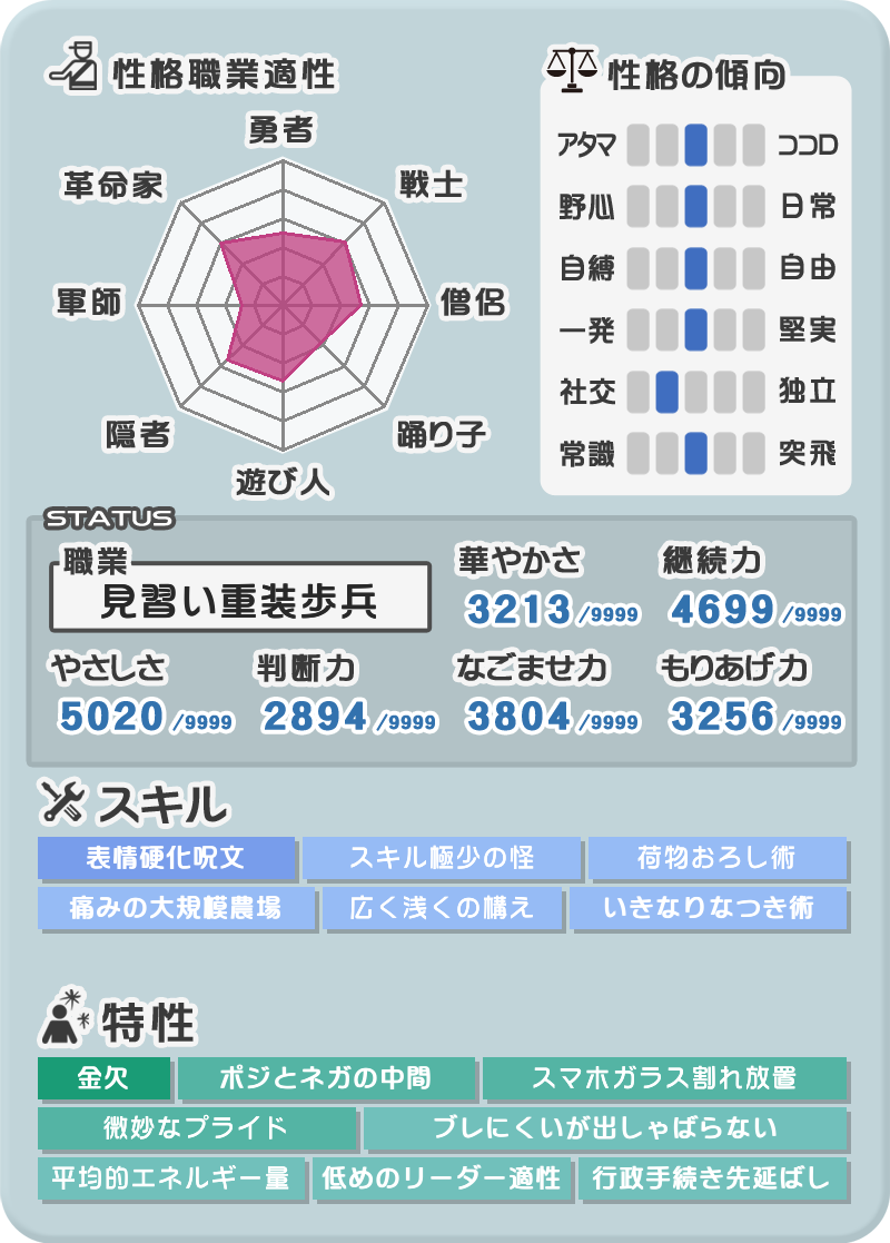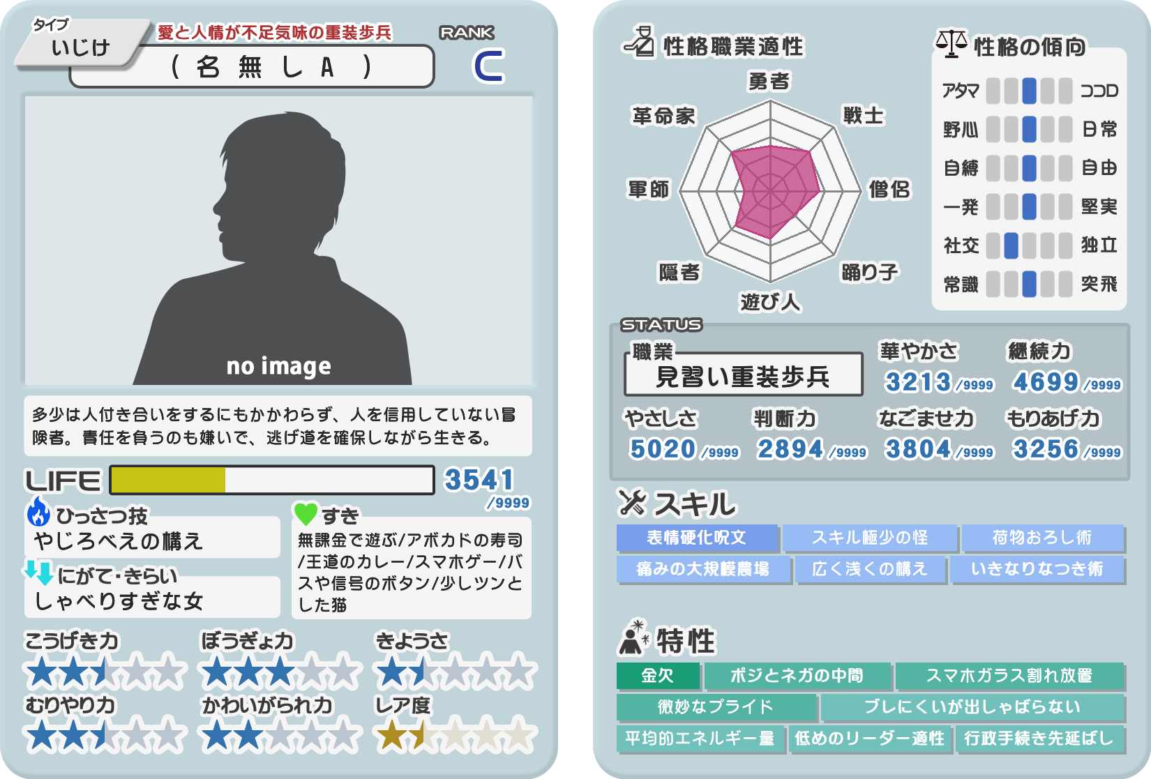 スキルは得意技(やりがち、起こりがちなこと等)、特性はその人が持つ特徴です。背景色が濃いほどに「冒険者に合っている」ということを表しています。