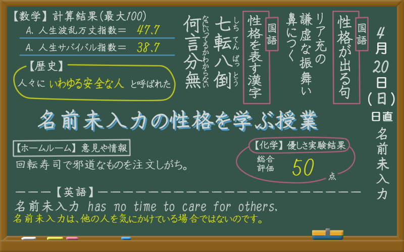 漢字や英語、その他さまざまな表現であなたの恋愛を黒板に書き記します。多種多様すぎる診断結果に唸ってください。