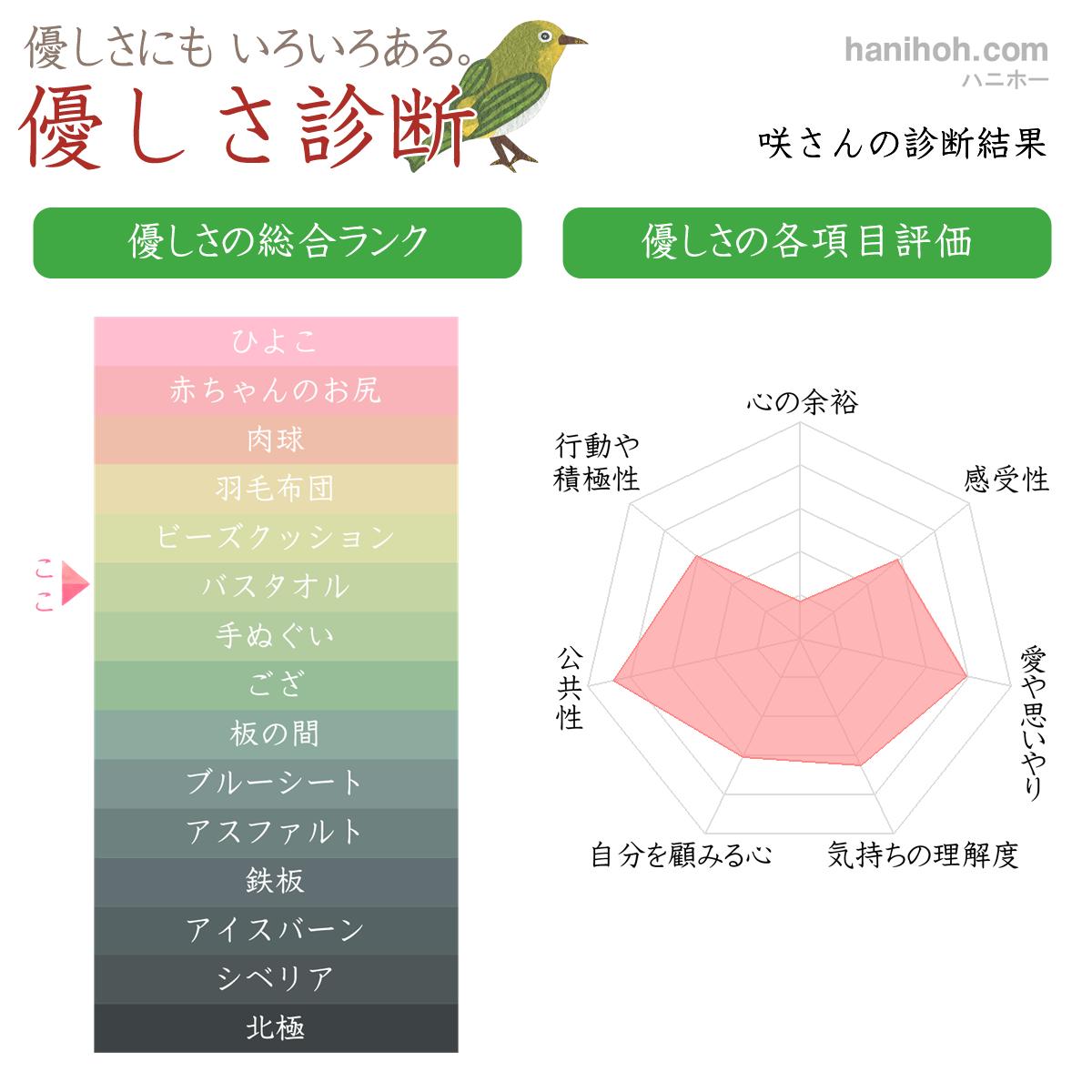 咲さんは、愛や思いやりが「まぁまぁある」と判定されました。人の気持ちを大切にする心が、しっかりとあります。