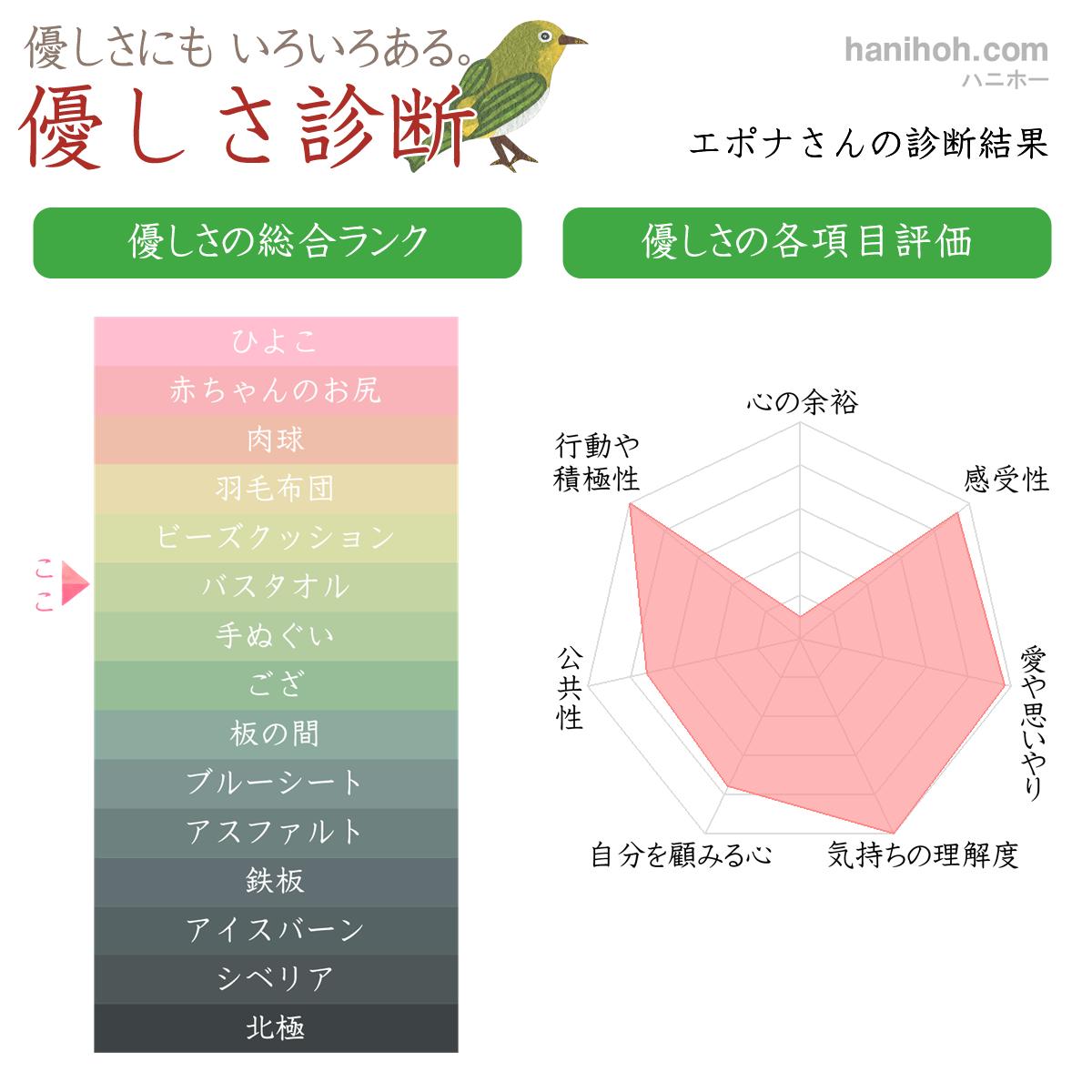 エポナさんは、愛や思いやりが「とても深い」と判定されました。人の気持ちを思い、その幸せを心から願っているようです。