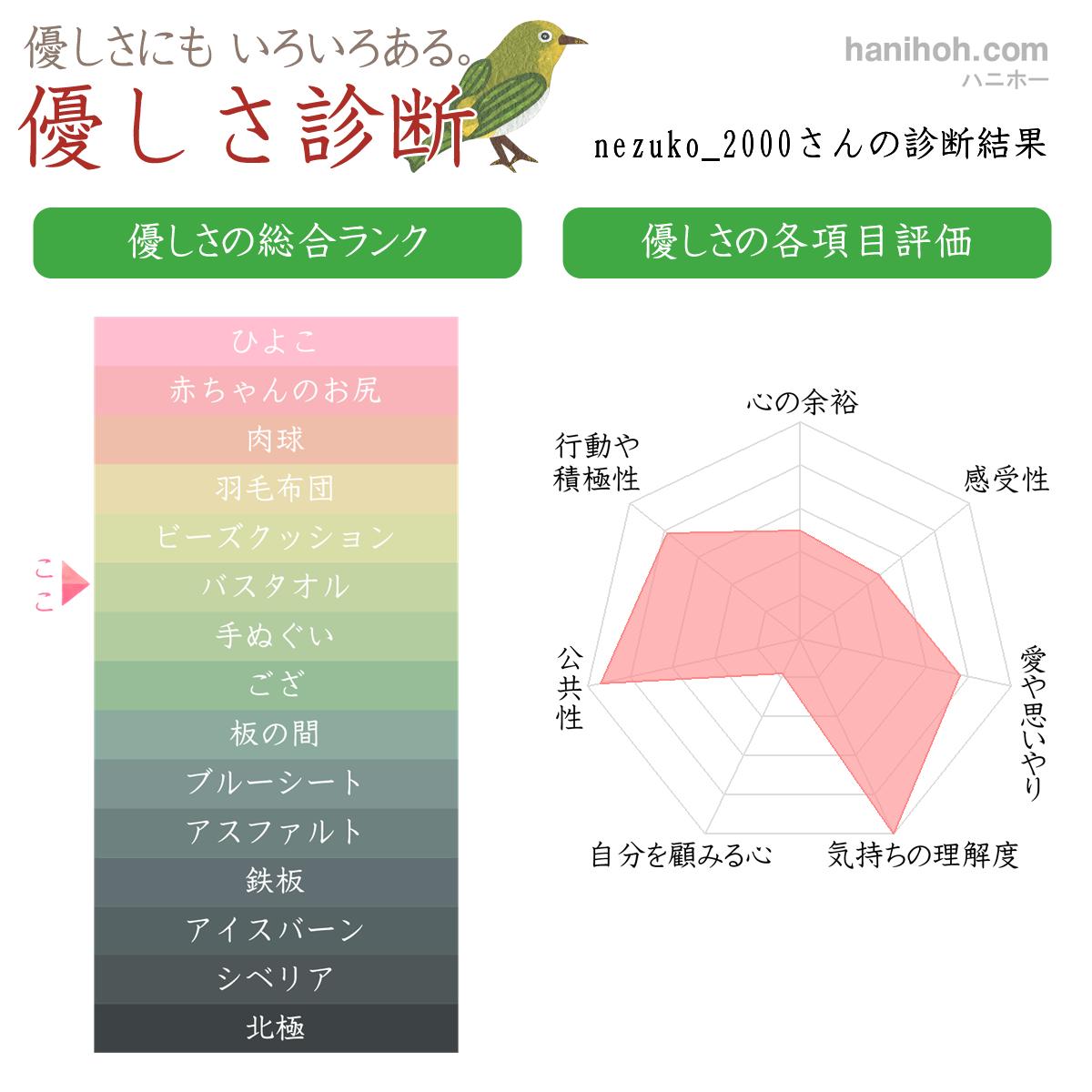 nezuko_2000さんは、愛や思いやりが「まぁまぁある」と判定されました。人の気持ちを大切にする心が、しっかりとあります。